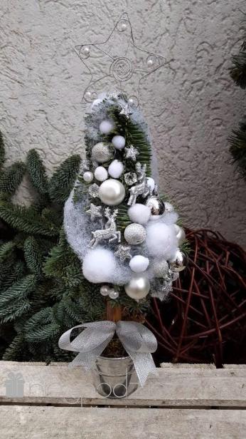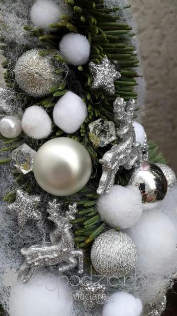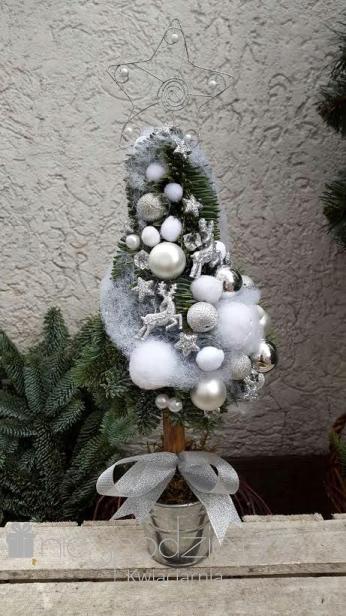 Choinka naturalna w srebrnych kolorach.