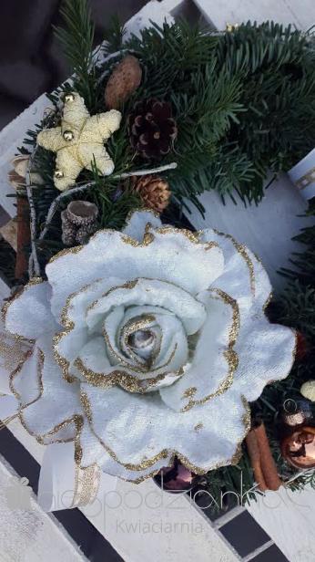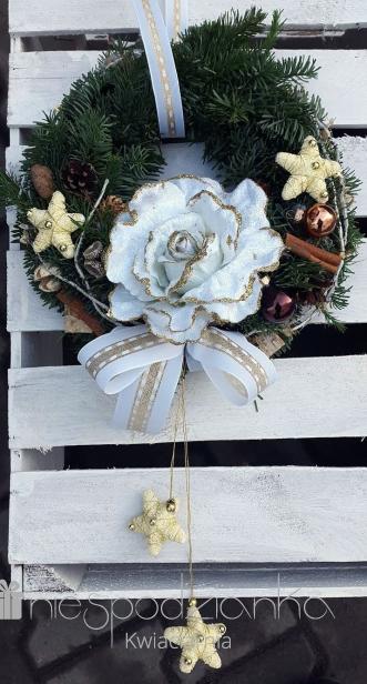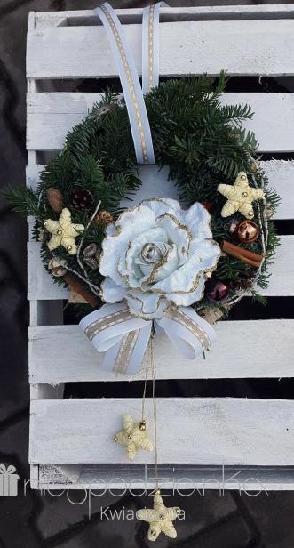 Koło z różą w złocie i bieli.